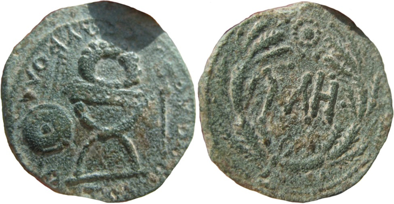 - ΒΑCΙΛΕωC CΑΥΡΟΜΑΤΟΥ. Курульное кресло с венком, слева круглый щит и копье, справа скипетр с бюстом