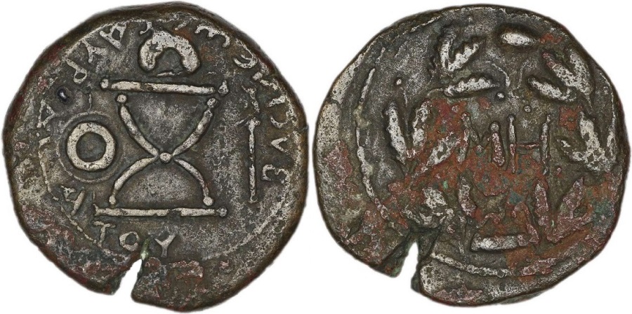 - ΒΑCΙΛΕωC CΑΥΡΟΜΑΤΟΥ. Курульное кресло с венком, слева круглый щит и копье, справа скипетр с бюстом