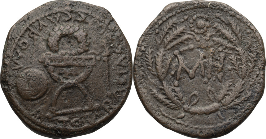 - ΒΑCΙΛΕωC CΑΥΡΟΜΑΤΟΥ. Курульное кресло с венком, слева круглый щит и копье, справа скипетр с бюстом