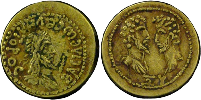 Бюсты Марка Аврелия и Луция Вера, год ΞΥ (460 г. б.э.), между ними "точка"