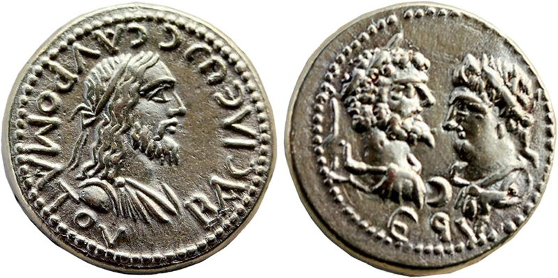 Бюсты Септимия Севера и Каракаллы, год ΕqΥ (495 г. б.э.), между ними "полумесяц"