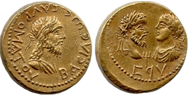 Бюсты Септимия Севера и Каракаллы, между ними «трезубец», год ςqΥ (496 г. б. э.).