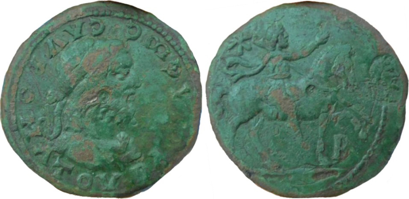 - Царь на коне вправо, Правая рука поднята вверх, в левой - копье. Справа внизу