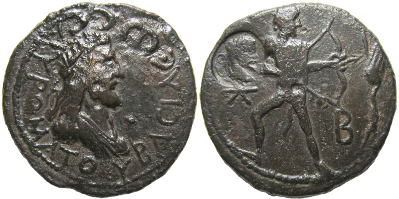ΒΑCΙΛΕωC CΑΥΡΟΜΑΤΟΥ. Бюст царя в повязке вправо, справа от бюста звезда выполненная схематично точками