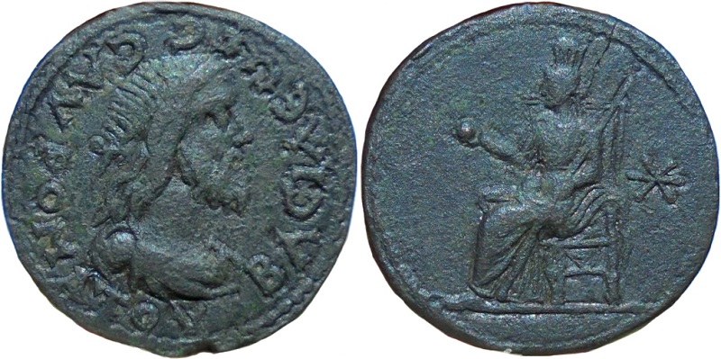 Богиня с длинным жезлом сидит на троне влево, в правой руке - сфера, справа звезда.