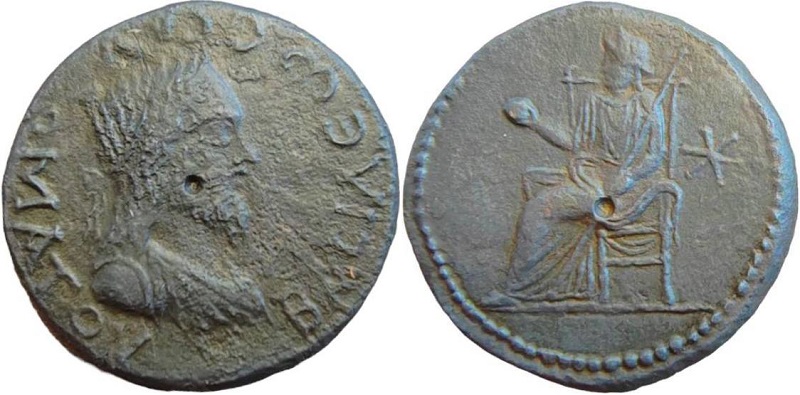 Богиня с длинным жезлом сидит на троне влево, в правой руке - сфера, справа звезда.