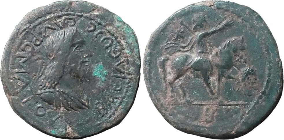 Царь на коне вправо, правая рука поднята в жесте "адорации", в левой - копье. Справа голова Септимия Севера вправо, слева - звезда. Внизу, под чертой -Β
