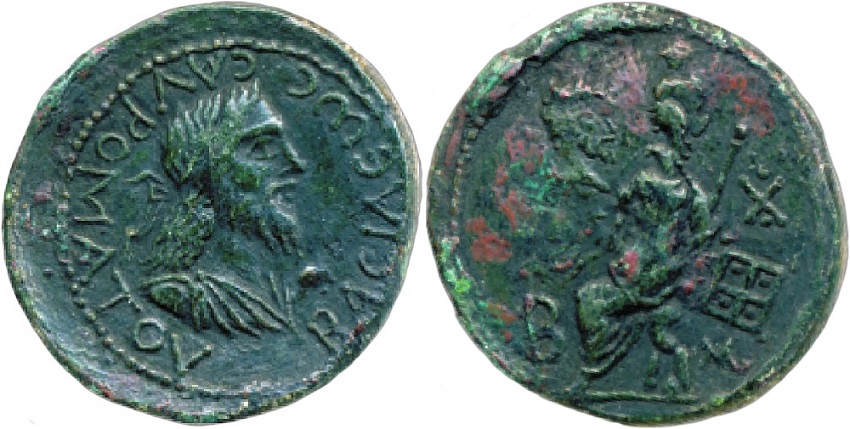 - ΒΑCΙΛΕωC CΑΥΡΟΜΑΤΟΥ. Бюст царя в повязке вправо.