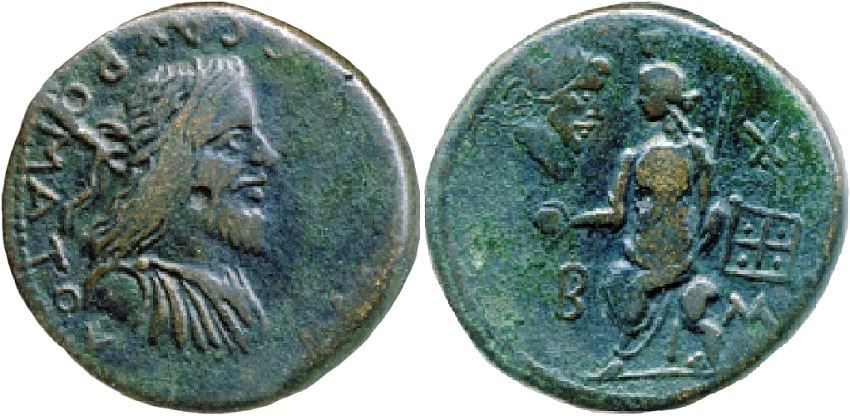 - Богиня на троне влево, в правой руке - сфера, в левой -длинный жезл. В поле слева вверху бюст Септимия Севера вправо, внизу В, справа звезда