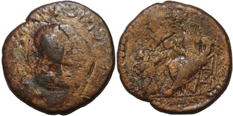 Богиня на троне с жезлом влево, перед нею фигурка Ники, вверху голова Септимия Севера влево, справа звезда