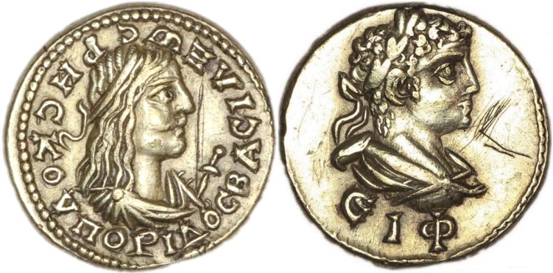 - ΒΑCΙΛΕωC ΡΗCΚΟΥΠΟΡΙΔΟC. Бюст царя вправо, справа «меч»