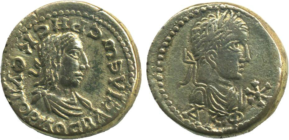 - Бюст императора вправо, год ΑΚΦ (521 г. б.э.), справа "звезда"