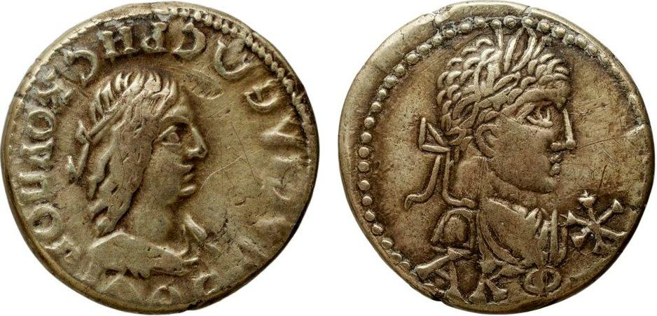 - Бюст императора вправо, год ΑΚΦ (521 г. б.э.), справа "звезда"