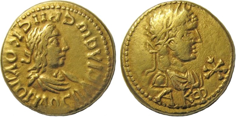 - Бюст императора вправо, год ΑΚΦ (521 г. б.э.), справа "звезда"