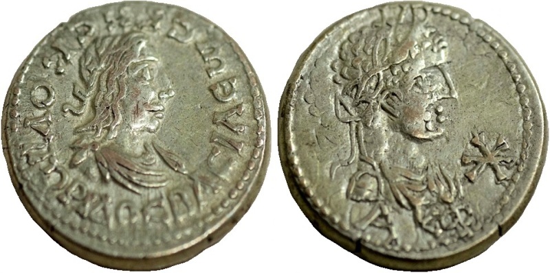 - Бюст императора вправо, год ΑΚΦ (521 г. б.э.), справа "звезда"