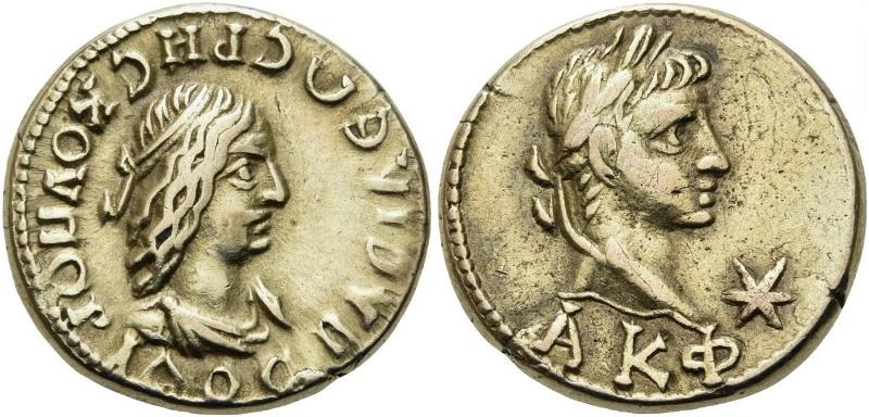- Бюст императора вправо, год ΑΚΦ (521 г. б.э.), справа "звезда"