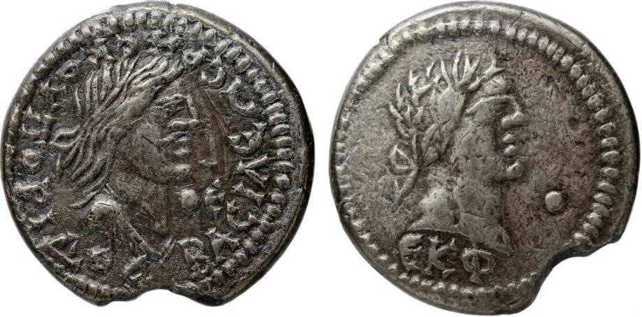 Бюст императора вправо, внизу год ΕΚΦ (525 г. б. э.), справа «точка»