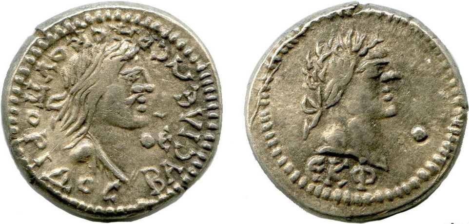 Бюст императора вправо, внизу год ΕΚΦ (525 г. б. э.), справа «точка»