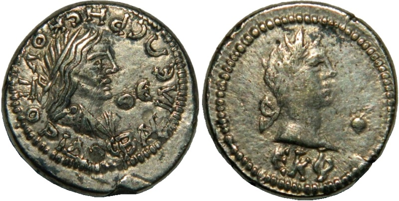 Бюст императора вправо, внизу год ΕΚΦ (525 г. б. э.), справа «точка»
