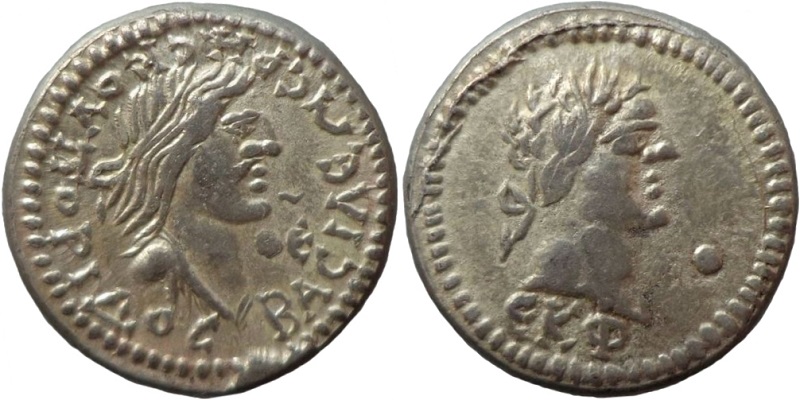 Бюст императора вправо, внизу год ΕΚΦ (525 г. б. э.), справа «точка»