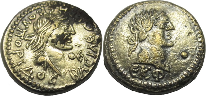 Бюст императора вправо, внизу год ΕΚΦ (525 г. б. э.), справа «точка»