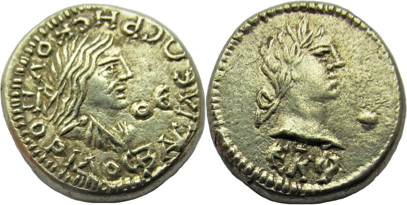 Бюст императора вправо, внизу год ΕΚΦ (525 г. б. э.), справа «точка»