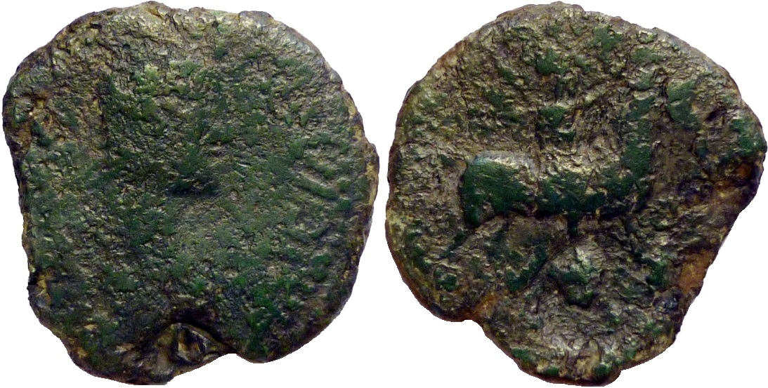 Монета с двумя надчеканками. На аверсе надчеканка времени Ининфимея в виде литеры А с изогнутой гастой. Пример такой надчеканки Н.А. Фролова том I, таб. L, ил.21. На реверсе надчекан в виде "головы".