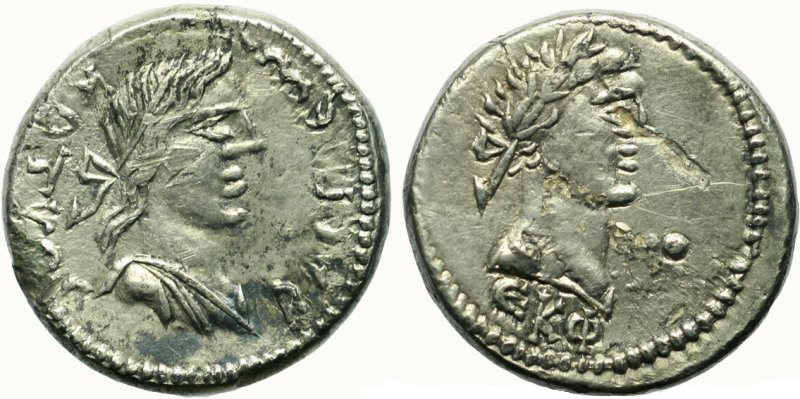 - Бюст императора вправо, год ΕΚΦ (525 г. б.э.), справа «точка»