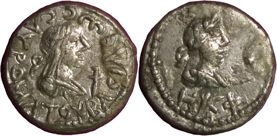 Бюст императора вправо, год НΚΦ (528 г. б.э.), справа удалены точки