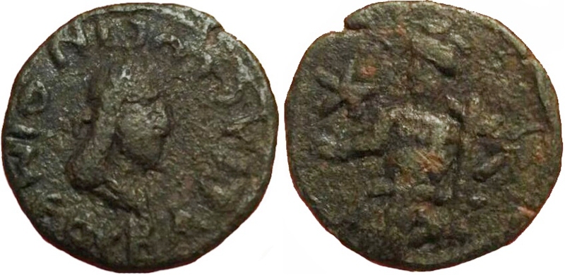 Разновидность по каталогу (1986 г.) В.А.Анохина №686 со знаком денария выше руки. ---------------------------- В каталоге (1986 г.) В.А.Анохина номинал указан как двойной денарий, но знак удвоения денария отсутствует. Так же описание реверса как "Геракл с палицей" не имеет оснований.
