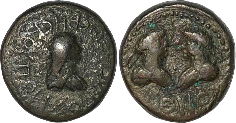 - Два бюста, между ними «точка», год ΘΝΦ (559 г. б. э.)
