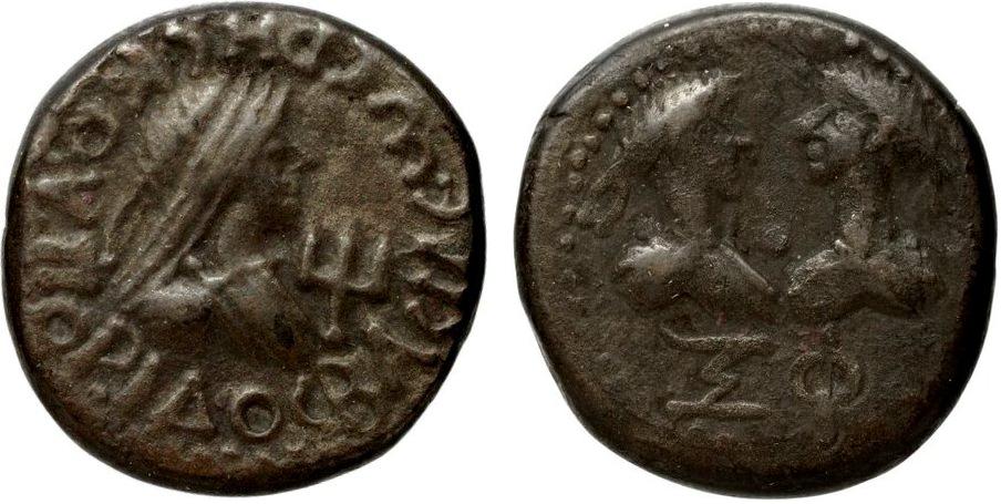- ΒΑCΙΛΕωC ΡΗCΚΟΥΠΟΡΙΔΟ. Бюст царя вправо, «трезубец»