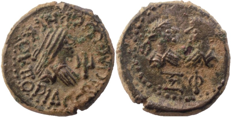 - ΒΑCΙΛΕωC ΡΗCΚΟΥΠΟΡΙΔΟ. Бюст царя вправо, «трезубец»