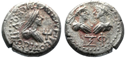 - Два бюста, между ними «точка»,год ΞΦ (560 г. б. э.)