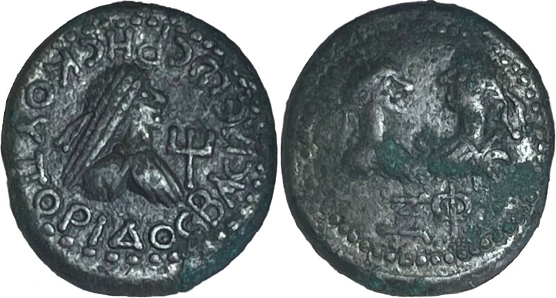 - ΒΑCΙΛΕωC ΡΗCΚΟΥΠΟΡΙΔΟ. Бюст царя вправо, «трезубец»