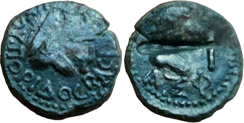 - ΒΑCΙΛΕωC ΡΗCΚΟΥΠΟΡΙΔΟC. Бюст царя вправо, справа «трезубец»