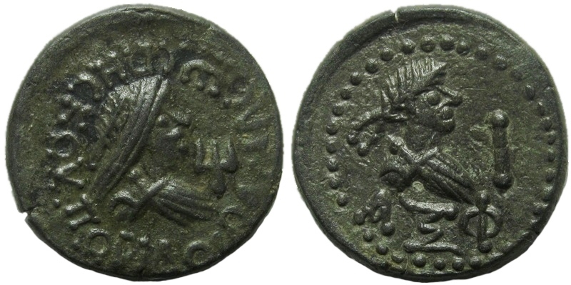 - ΒΑCΙΛΕωC ΡΗCΚΟΥΠΟΡΙΔΟC. Бюст царя вправо, справа «трезубец»