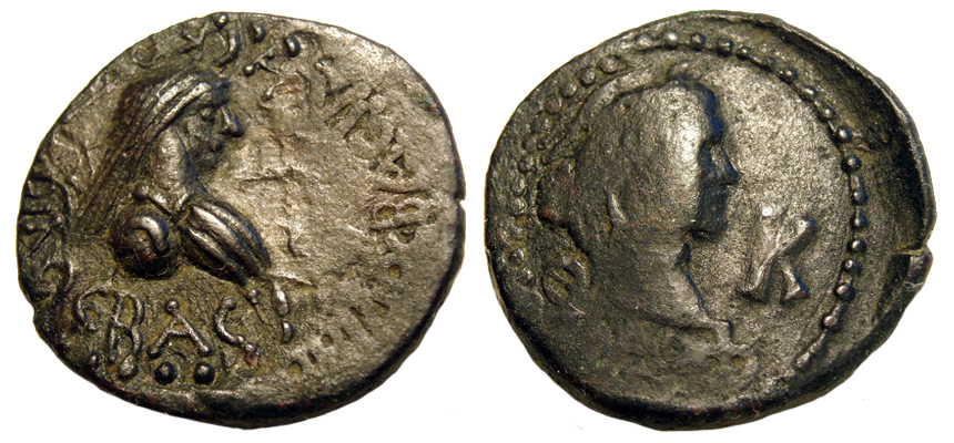 Бюст императора вправо, внизу год ΒΞΦ (562 г. б.э.), справа К