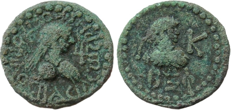 Бюст императора вправо, внизу год ΒΞΦ (562 г. б.э.), справа К