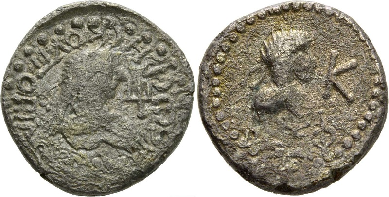 Бюст императора вправо, внизу год ΒΞΦ (562 г. б.э.), справа К
