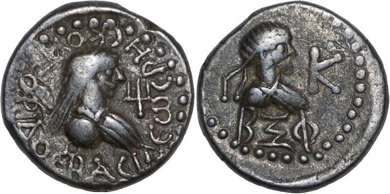 Бюст императора вправо, внизу год ΒΞΦ (562 г. б.э.), справа К