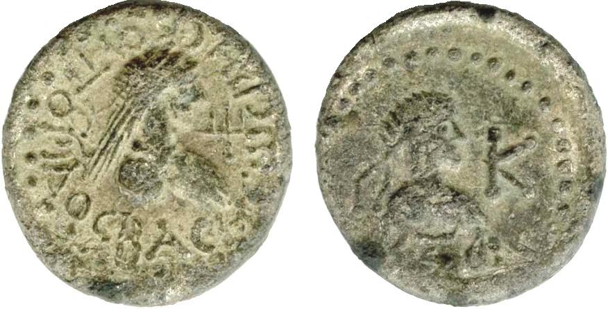 Бюст императора вправо, внизу год ΒΞΦ (562 г. б.э.), справа К