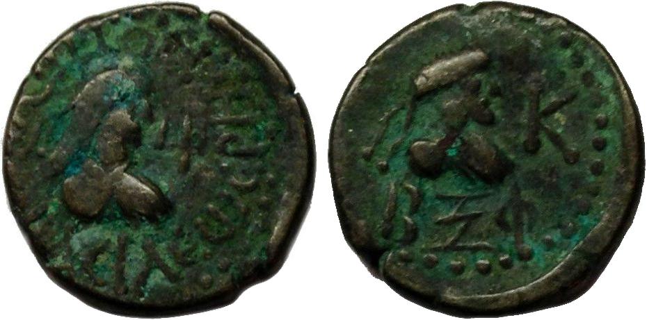 Бюст императора вправо, внизу год ΒΞΦ (562 г. б.э.), справа К