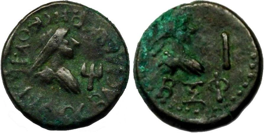 ΒΑCΙΛΕωC ΡΗCΚΟΥΠΟΡΙΔΟC. Бюст царя вправо, справа «трезубец»