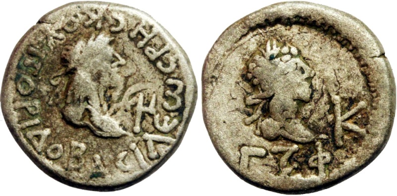 - Бюст императора вправо, внизу год ΓΞΦ (563 г. б. э.), справа К