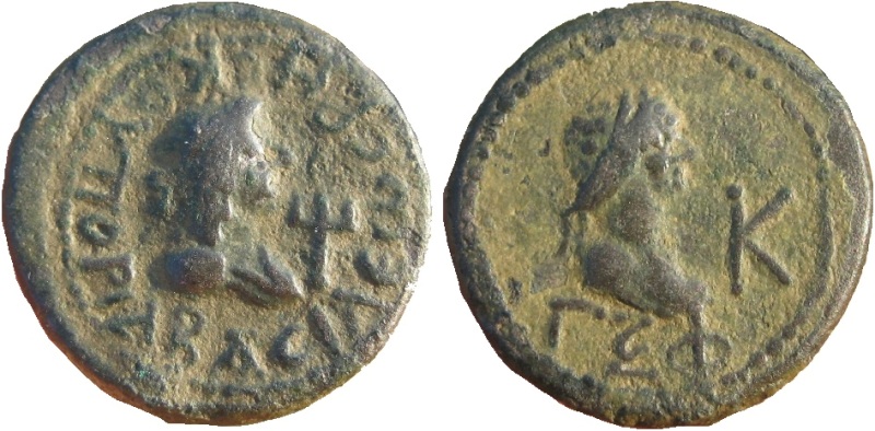 - Бюст императора вправо, внизу год ΓΞΦ (563 г. б. э.), справа К