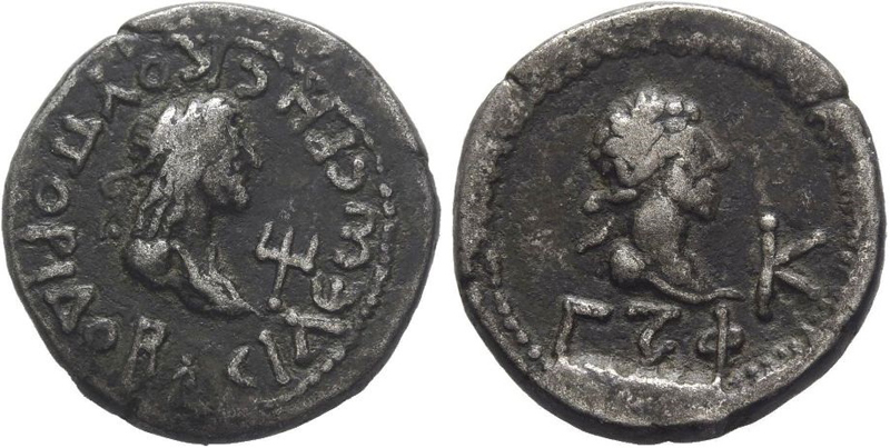 - Бюст императора вправо, внизу год ΓΞΦ (563 г. б. э.), справа К