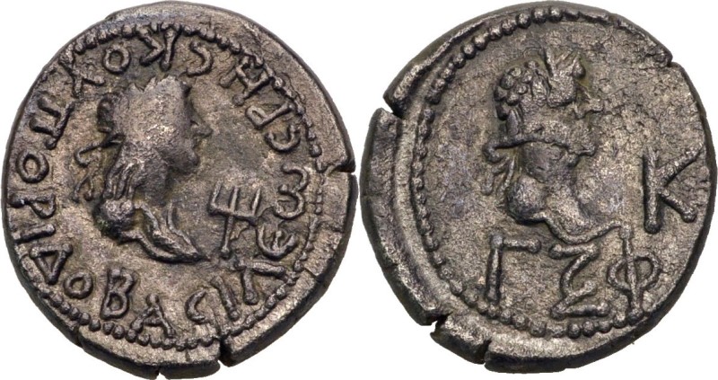 - Бюст императора вправо, внизу год ΓΞΦ (563 г. б. э.), справа К