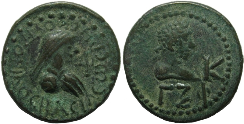 - Бюст императора вправо, внизу год ΓΞΦ (563 г. б. э.), справа К