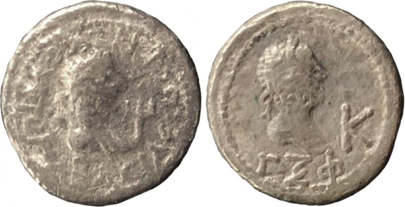- Бюст императора вправо, внизу год ΓΞΦ (563 г. б. э.), справа К